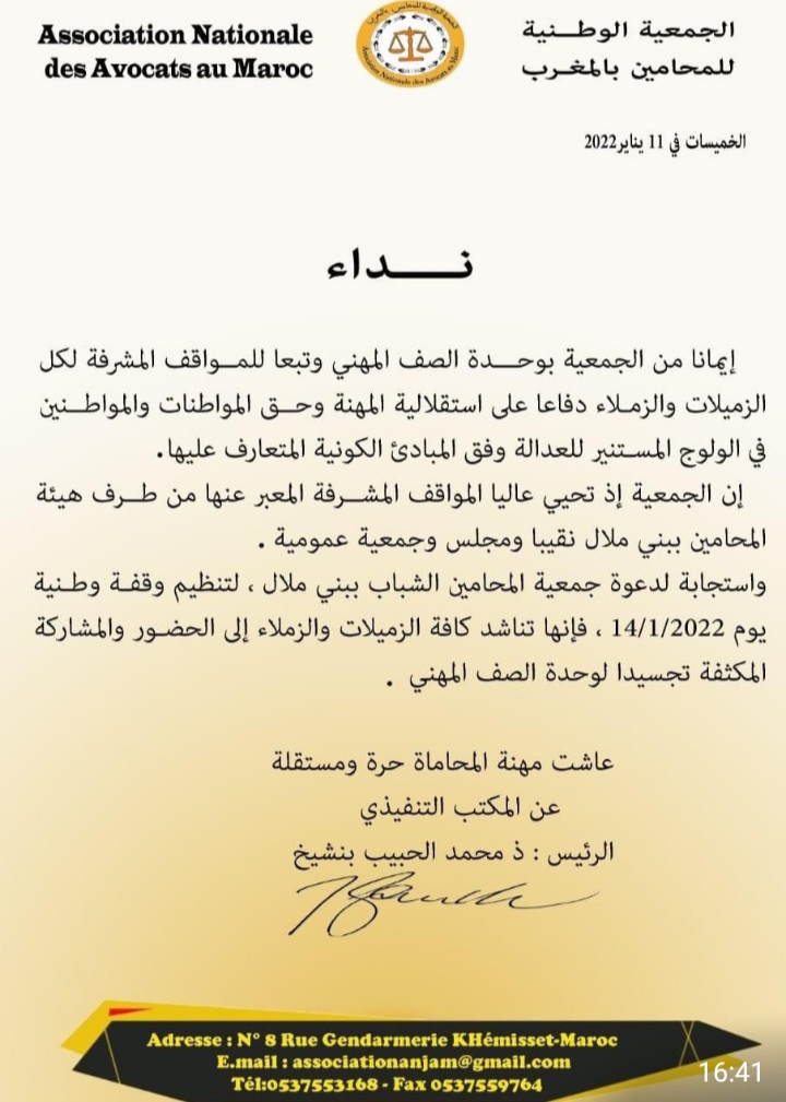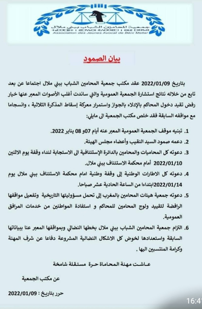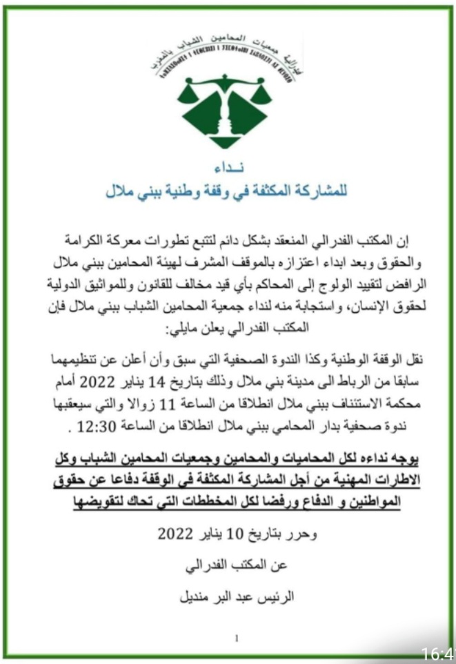 كل التنظيمات المنضوية تحت لواء فيدرالية جمعيات المحامين الشباب أعلنت مشاركتها في الوقفة الوطنية أمام محكمة الاستئناف ببني ملال، وبدورها نقابة المحامين بالمغرب، والجمعية الوطنية للمحامين بالمغرب واتحاد المحامين بأكادير وكلميم والعيون..