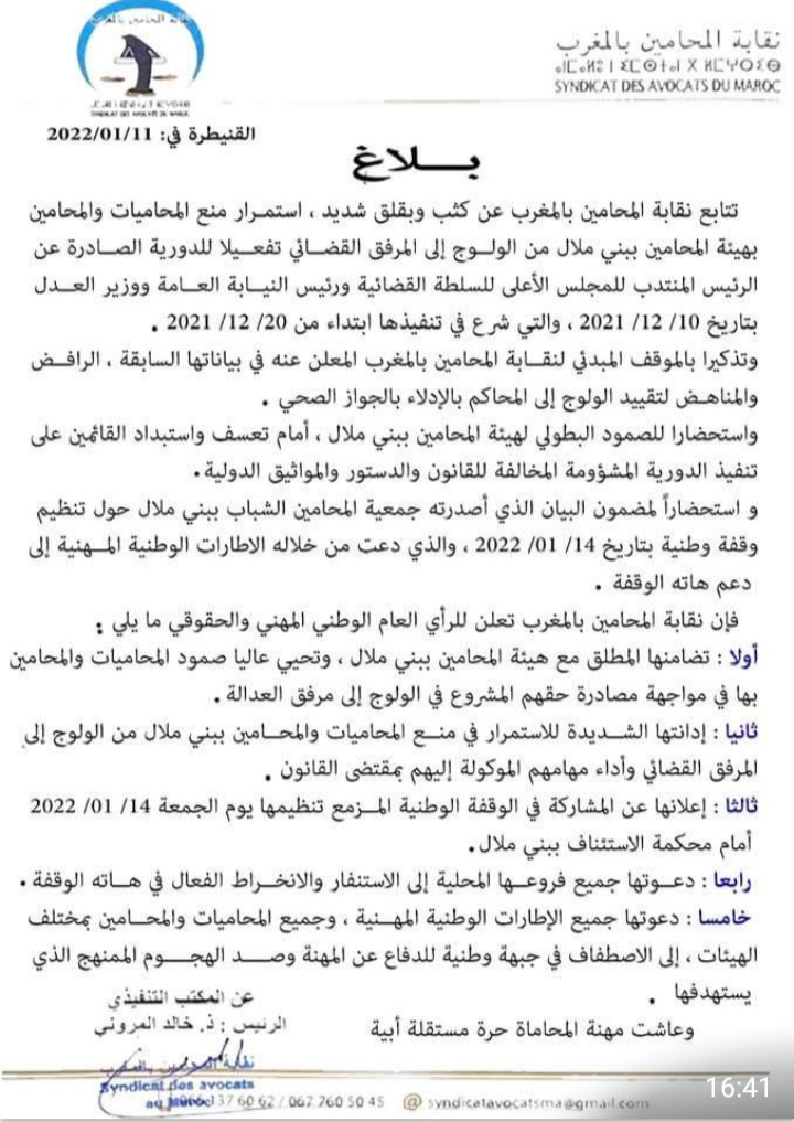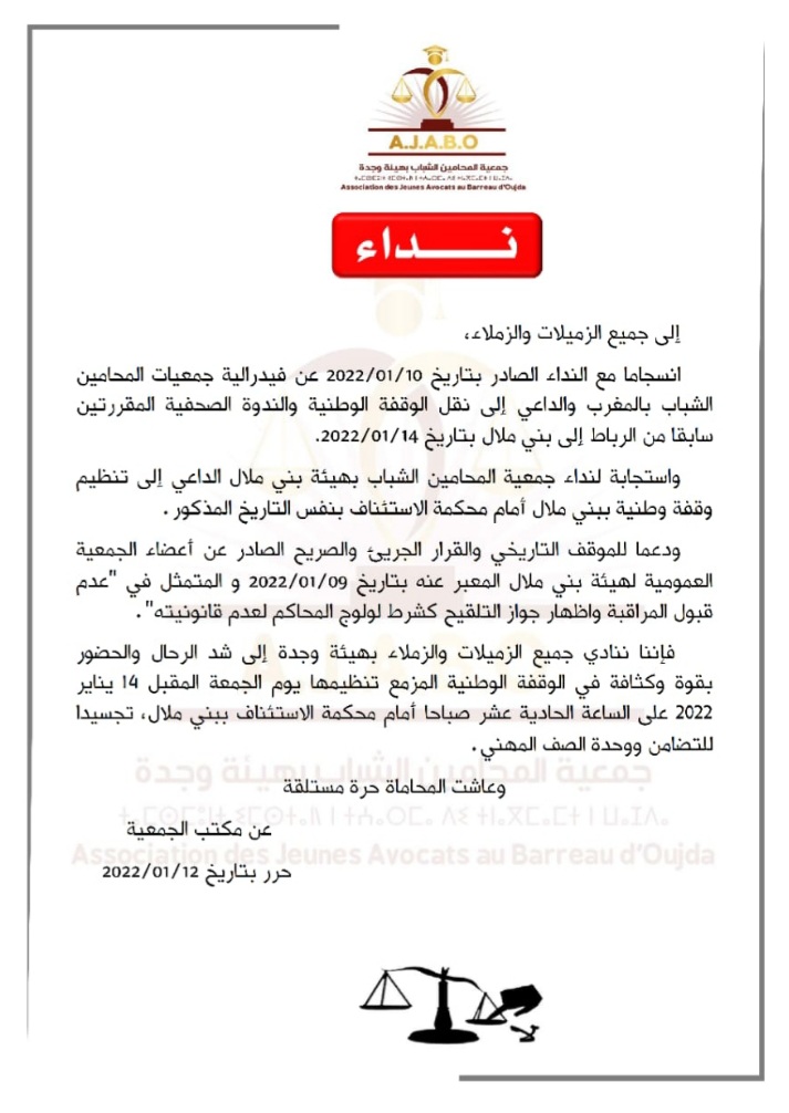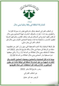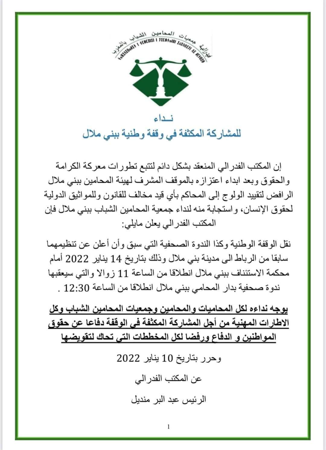 الوقفة التي ستنظم يوم الجمعة 14 يناير 2022، وستعقبها ندوة صحفية، تأتي ضمن الحركة الاحتجاجية التي نظمتها مجالس هيئات المحامين بالمغرب وتنظيمات شبابية ونقابية، بعد فرض وزارة العدل ورئاسة النيابة العامة والمجلس الأعلى للسلطة القضائية، الجواز الصحي لولوج المحاكم، حيث تم شل مرافق المحاكم، لأكثر من أسبوع، وصدور بلاغ لجمعية هيئات المحامين يدعو فيه إلى استئناف العمل، بعد اتفاق مع النيابة العامة والمجلس القضائي لترك مسألة المراقبة وفق خصوصيات المجالس، وهو الاتفاق الذي أعلنت فيدرالية المحامين الشباب رفضه، داعية إلى إسقاط الجواز الصحي بصفة نهائية، ومن خلال التنزيل، شكلت هيئة المحامين ببني ملال استثناء، حيث يوجد مقرها بداخل المحكمة، مما أبرز صعوبات في التوافق بين المجلس ورئاسة المحكمة، كانت تشهد فيه محيطها بشلل شبه يومي وقفات بقيادة نقيب المجلس..