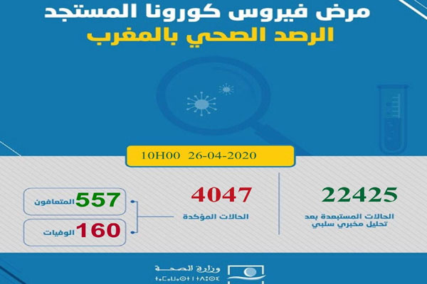 أعلنت وزارة الصحة، أنه تم تسجيل إلى حدود الساعة 10 من صباح يوم الأحد 26 أبريل الجاري، 150 حالة جديدة مؤكدة بفيروس كورونا، ليرتفع العدد الإجمالي لعدد الإصابات إلى 4047 حالة..وهذه بالتفصيل مستجدات الحالة الوبائية لفيروس كورونا بالمغرب إلى حدود الساعة 10 من صباح يوم الأحد 26 أبريل 2020: